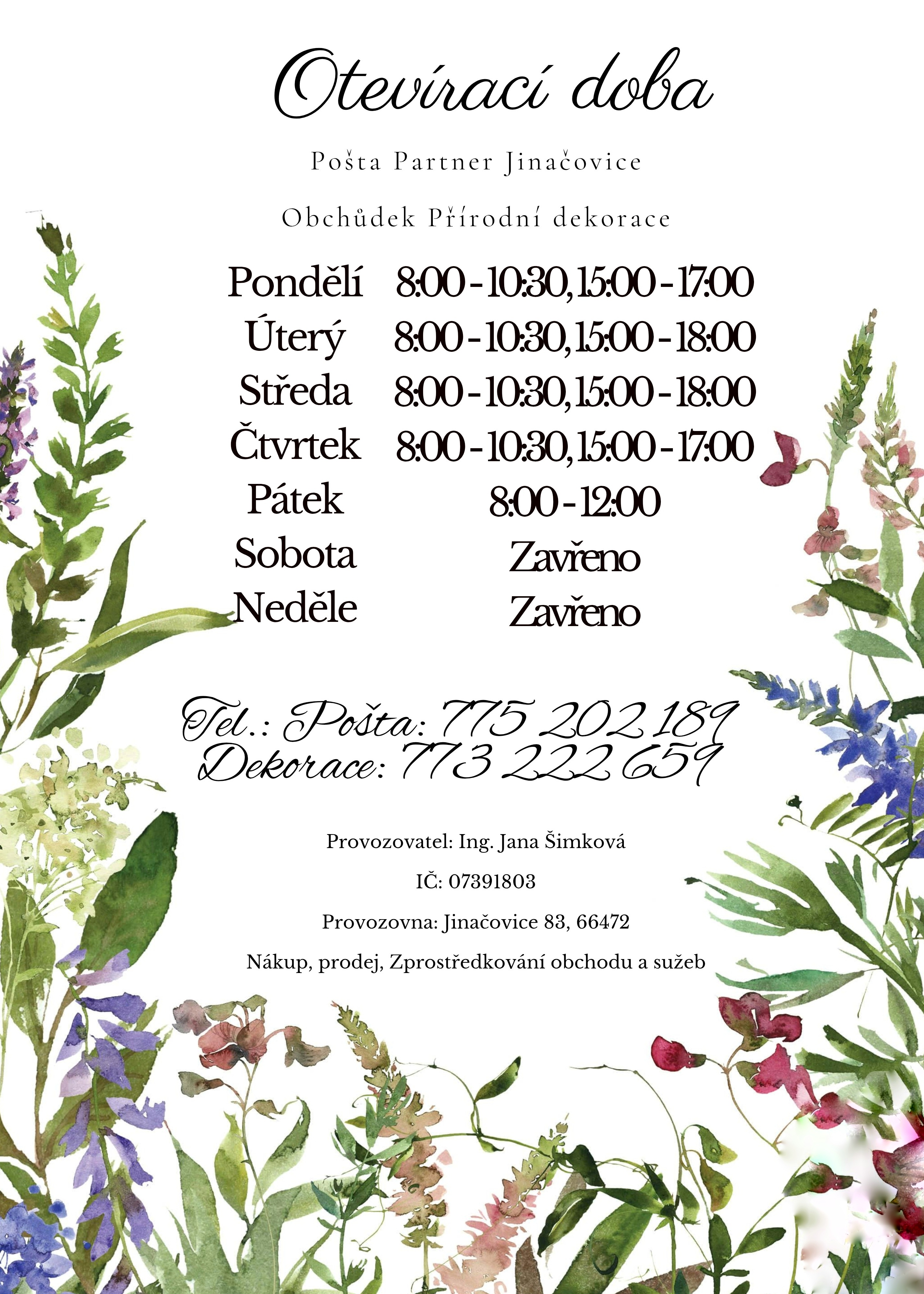 Malý útulný obchůdek v Jinačovicích je plný vůní sušených rostlin, květin a poctivé ruční práce. V obchůdku nabízím přírodní vázané věnce z vlastní dílny, dále pokojové květiny, sójové svíčky, ručně šité dekorace i dřevěné hry a hračky jiných lokálních tvůrců a značek. Nabídku obchodu pečlivě vybírám, přičemž kladu důraz na přírodní materiály, lokální zdroje, ekologické smýšlení výrobce a další společné hodnoty.