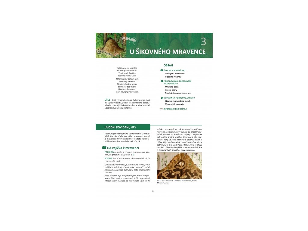 Metodika je rozdělená do devíti kapitol – zavede vás na návštěvu k devíti živočichům, představí nejen je samotné, ale také jejich přirozené prostředí a nezaměnitelnou funkci v ekosystému. Každá kapitola představuje výukový celek: obsahuje úvodní povídání a hry, přírodovědná pozorování, výtvarné či hudební aktivity a informace pro učitele.