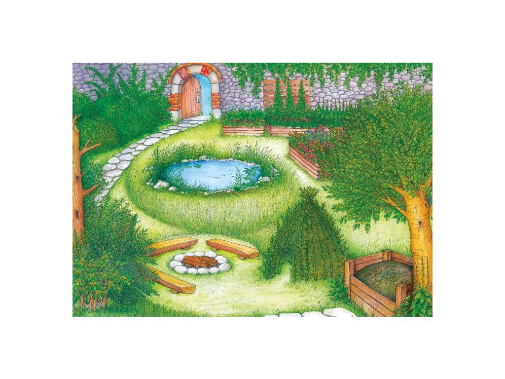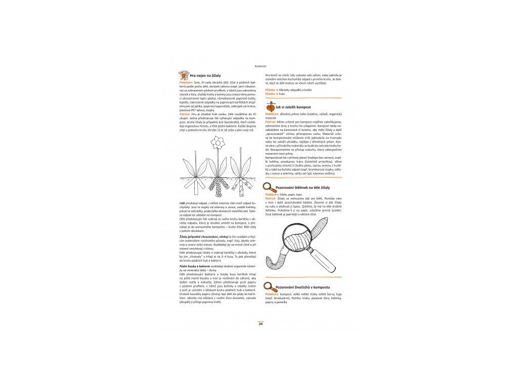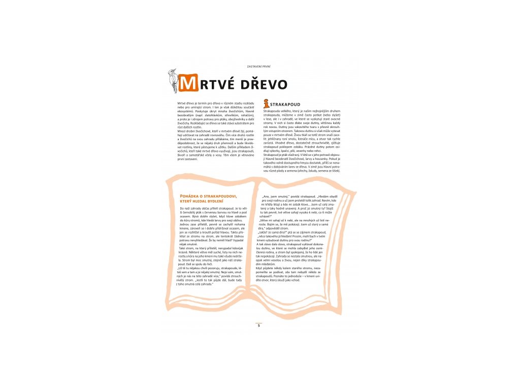 Sloha obsahuje podrobnou metodiku, která slouží učiteli a obsahuje informační podklady pro všechny nabízené činnosti. Je rozdělená na deset kapitol, z nichž každá se věnuje jednomu zákoutí zahrady a jeho typickým obyvatelům a rostlinám (mrtvé dřevo, keře, vrbový domeček, louka, kompost, strom, vyvýšené záhony, ohniště, divočina, jezírko). V každé z kapitol najdete potřebné informace a řadu námětů pro činnosti s dětmi – pohádku, tipy pro pozorování, hry a tvoření. Dále ve sloze najdete velký barevný obraz zahrady A1, který je určený na nástěnku ve třídě, a samostatný arch s kresbami zvířat a rostlin.